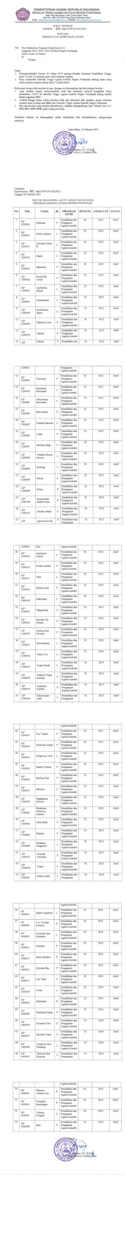 - Apabila hingga batas waktu tersebut tidak ada informasi dari saudara, secara otomatis saudara akan di drop out (DO) dari Sekolah Tinggi Agama Katolik Negeri Pontianak