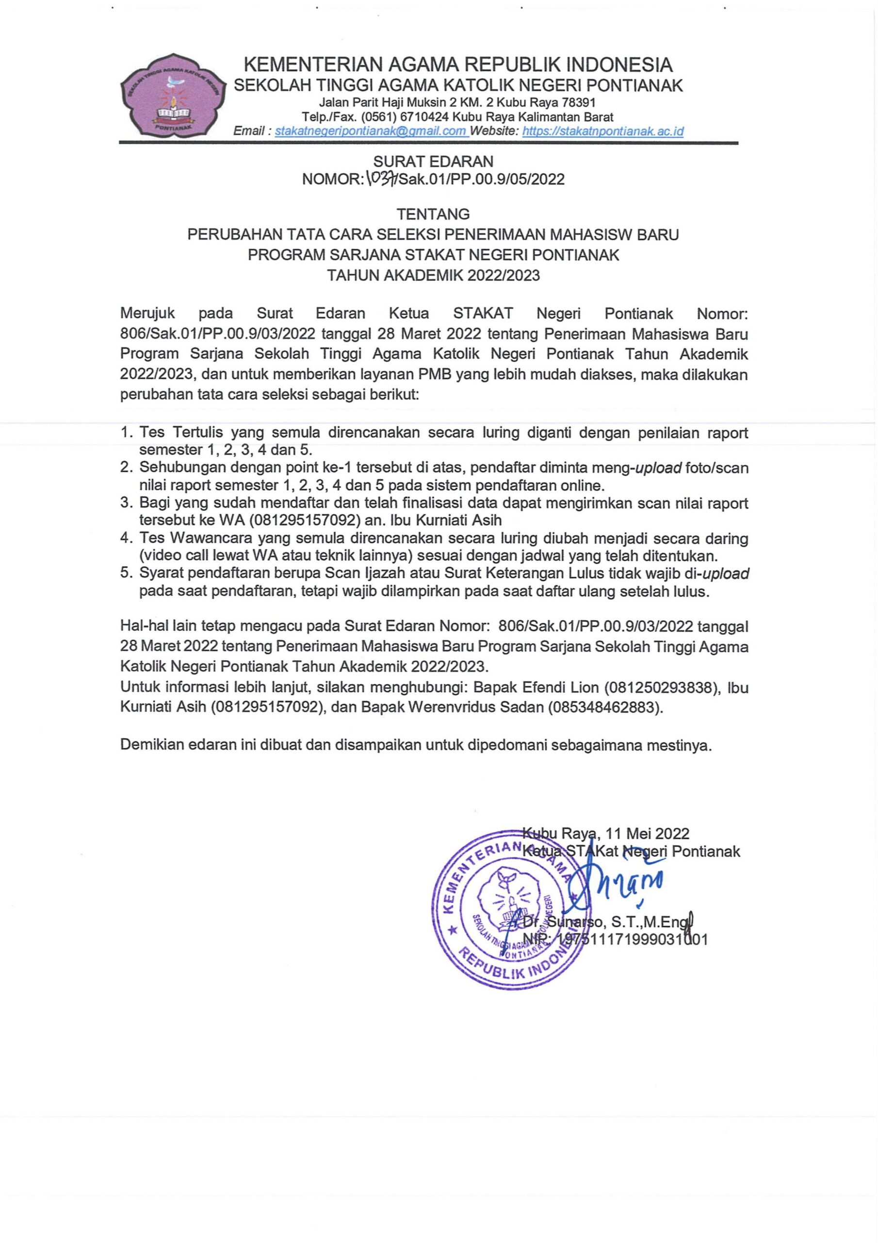 Pengumuman PERUBAHAN TATA CARA SELEKSI PMB PROGRAM SARJANA STAKAT N PONTIANAK Byadmin May 17, 2022December 28, 2025