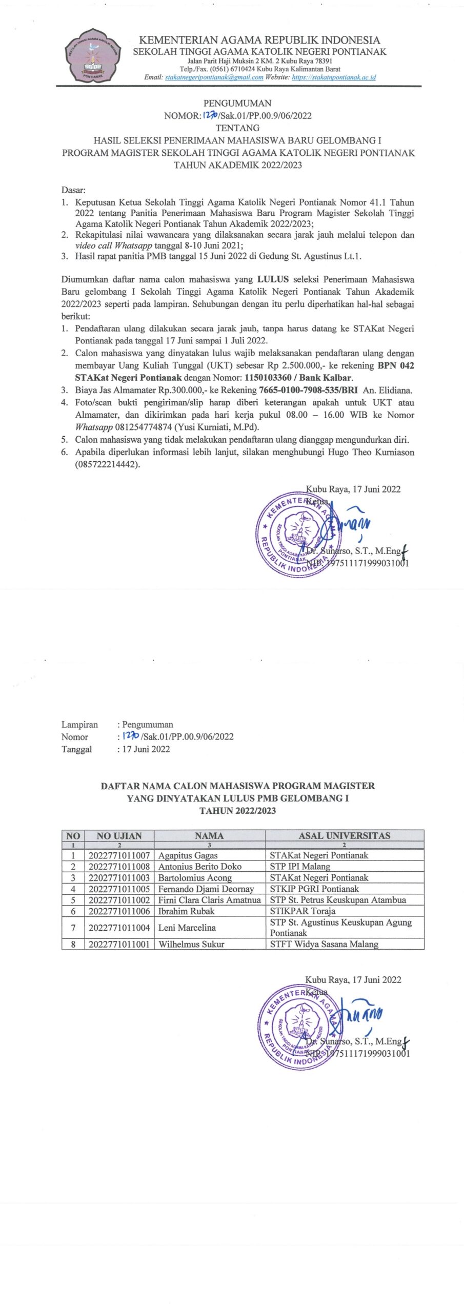 Pengumuman HASIL SELEKSI PENERIMAAN MAHASISWA BARU GELOMBANG 1 PROGRAM MAGISTER TAHUN AKADEMIK 2022/2023 STAKatN PONTIANAK Byadmin June 17, 2022December 28, 2025