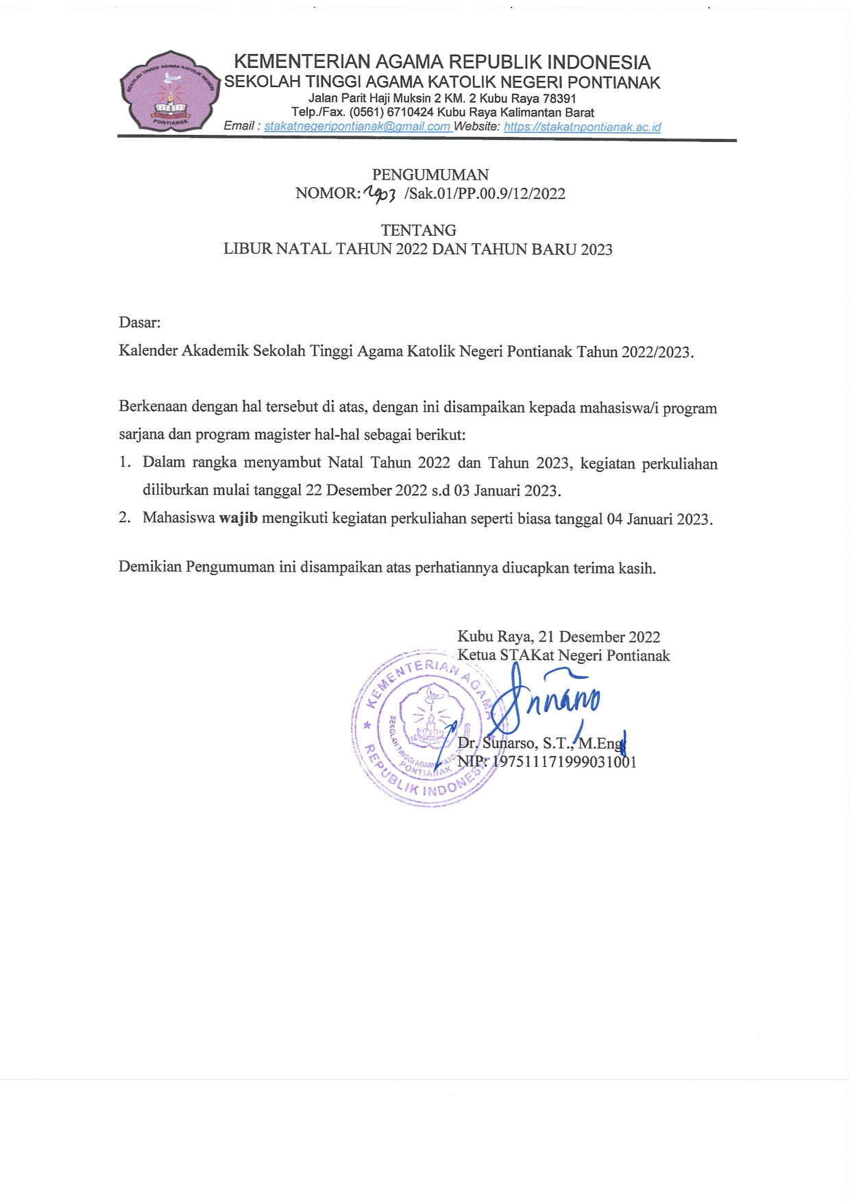 STAKat Negeri Pontianak membuka pendaftaran mahasiswa baru untuk program Magister Teologi Katolik tahun akademik 2021/2022. Detail prosedur pendaftaran, tanggal, syarat, jadwal tes seleksi hingga informasi mengenai registrasi lebih lanjut dijelaskan di dalam surat edaran. Apabila diperlukan informasi lebih lanjut, silahkan menghubungi panitia PMB. Terimakasih.
