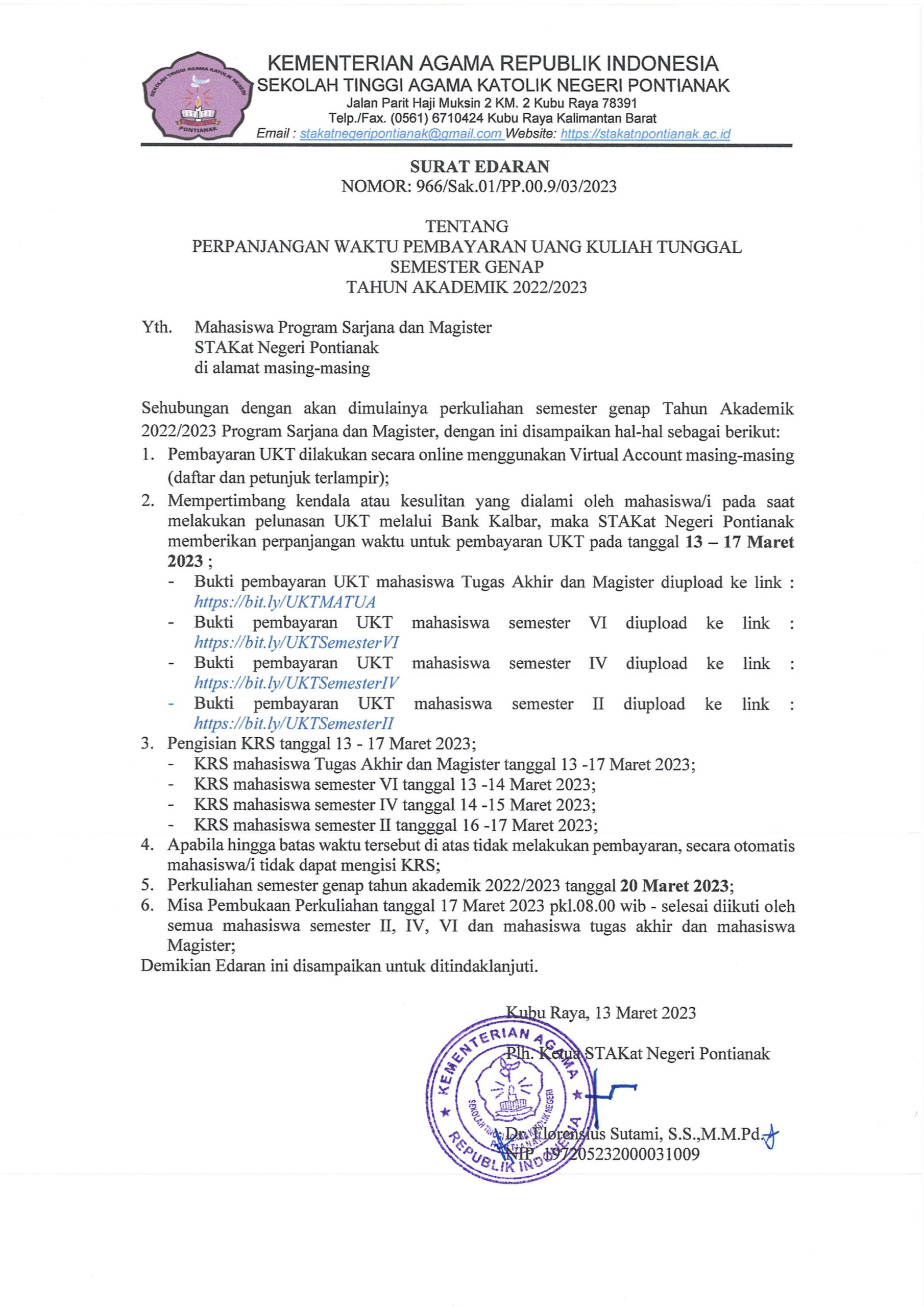 Diberitahukan kepada seluruh calon mahasiswa baru program sarjana Sekolah Tinggi Agama Katolik Negeri Pontianak untuk membaca surat edaran berikut.