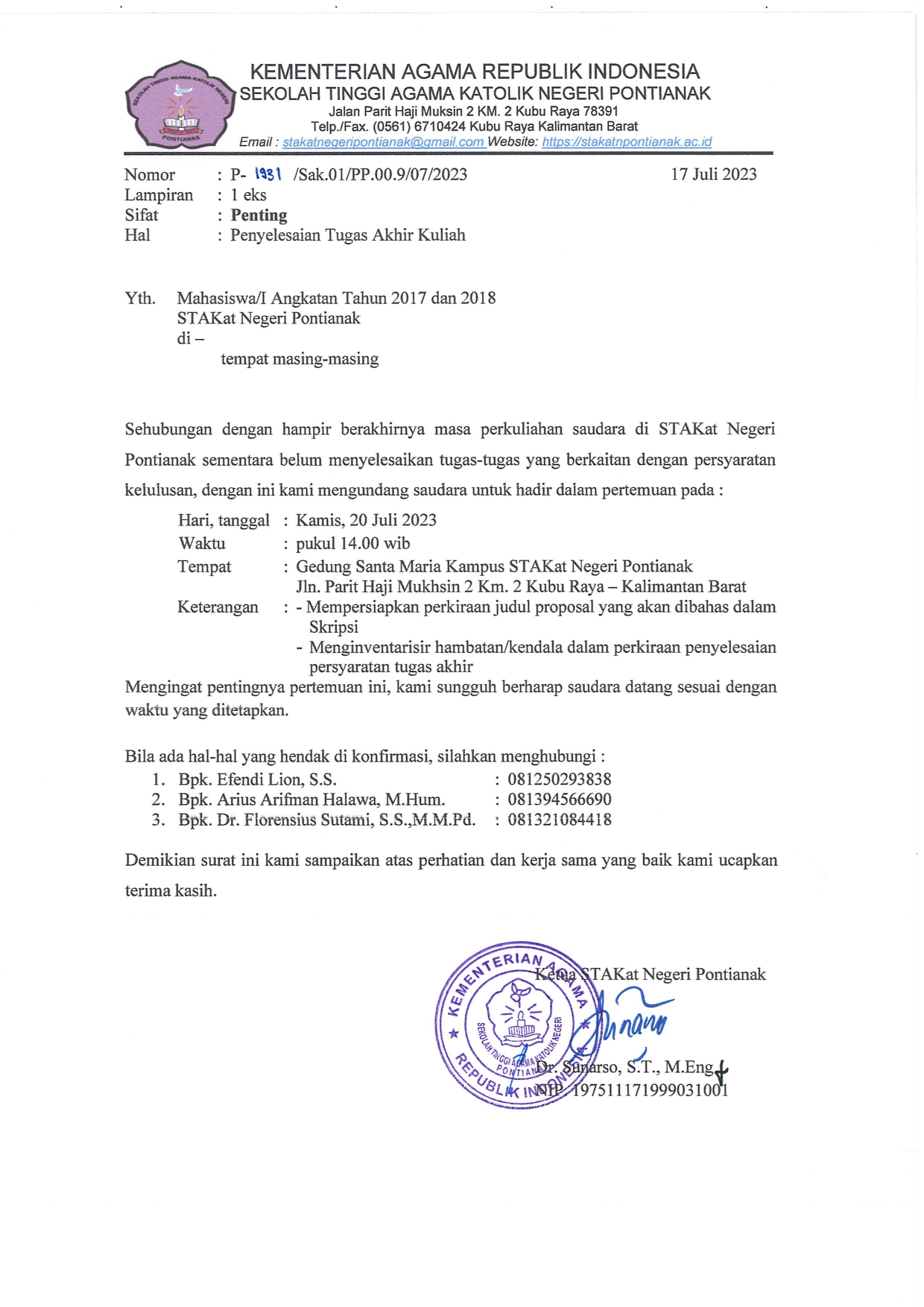 STAKat Negeri Pontianak membuka pendaftaran mahasiswa baru untuk program Magister Teologi Katolik tahun akademik 2021/2022. Detail prosedur pendaftaran, tanggal, syarat, jadwal tes seleksi hingga informasi mengenai registrasi lebih lanjut dijelaskan di dalam surat edaran. Apabila diperlukan informasi lebih lanjut, silahkan menghubungi panitia PMB. Terimakasih.