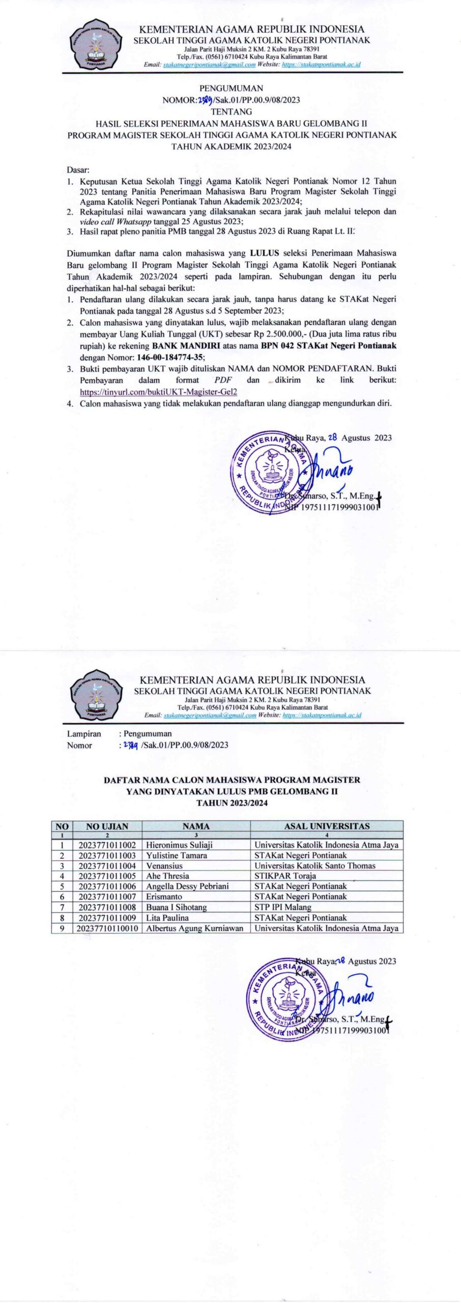 Pengumuman HASIL SELEKSI PENERIMAAN MAHASISWA BARU GELOMBANG II PROGRAM MAGISTER TAHUN AKADEMIK 2023/2024 STAKatN PONTIANAK Byadmin August 28, 2023December 28, 2025