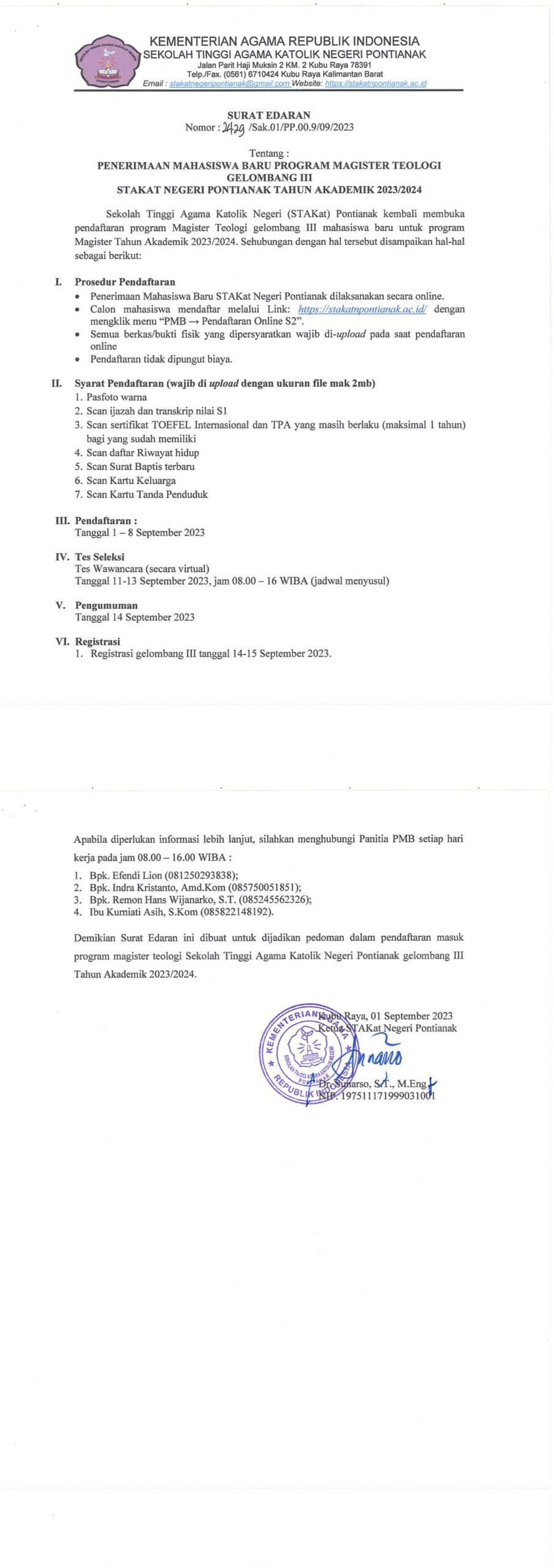 Yth. Para Mahasiswa/i Program Strata Satu (S-1) Angkatan 2012, 2013, 2014 STAKat Negeri Pontianak (Daftar nama terlampir) Disampaikan hal-hal sebagai berikut: Agar saudara segera menyelesaikan studi dan melunasi seluruh tunggakan biaya pendidikan (UKT) di Sekolah Tinggi Agama Katolik Negeri Pontianak paling lambat bulan Agustus 2021 Apabila hingga batas waktu tersebut tidak ada informasi dari saudara,…