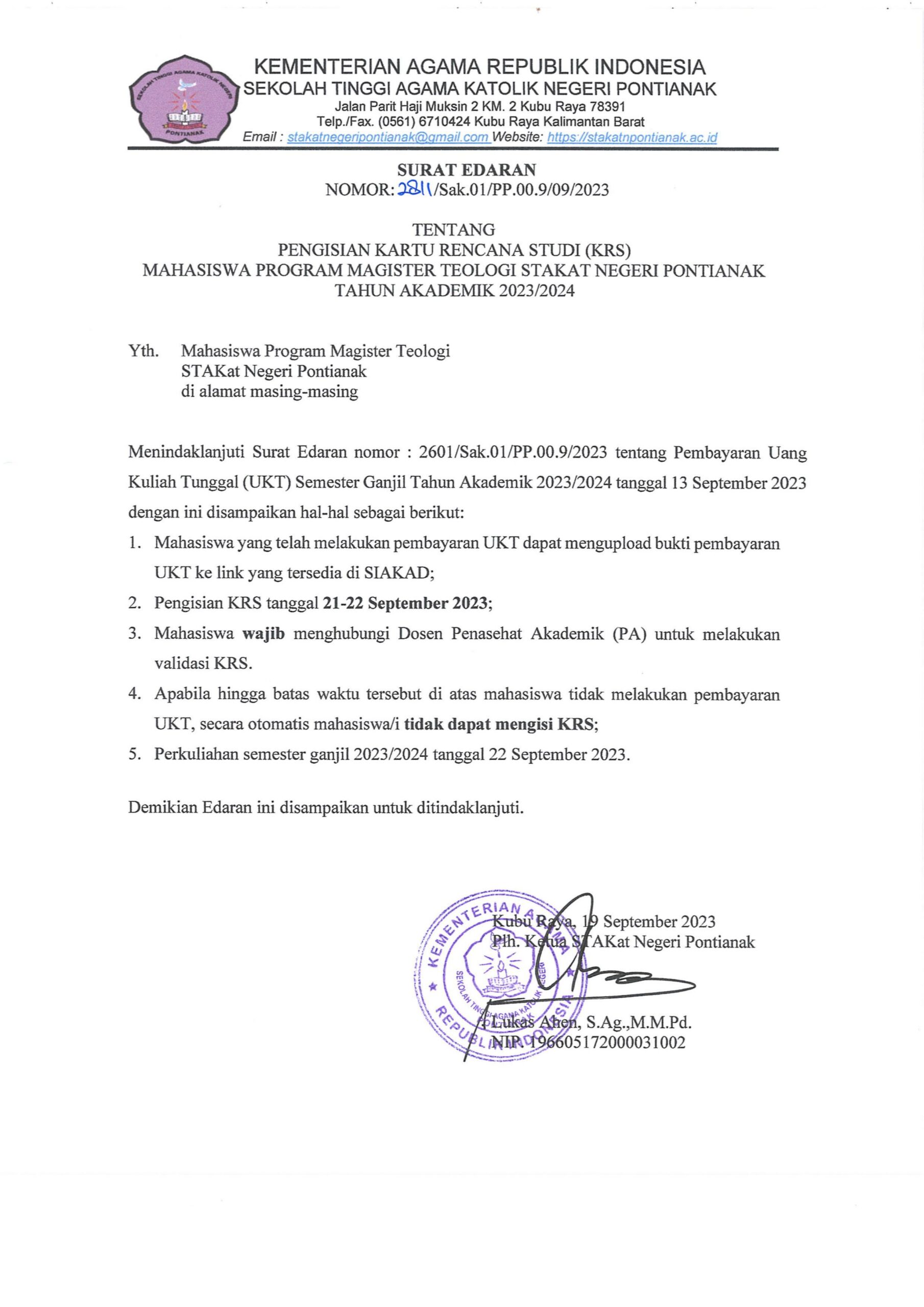 Pengumuman EDARAN PENGISIAN KRS PERIODE AKADEMIK GANJIL PROGRAM MAGISTER TEOLOGI KATOLIK Byadmin September 19, 2023December 28, 2025