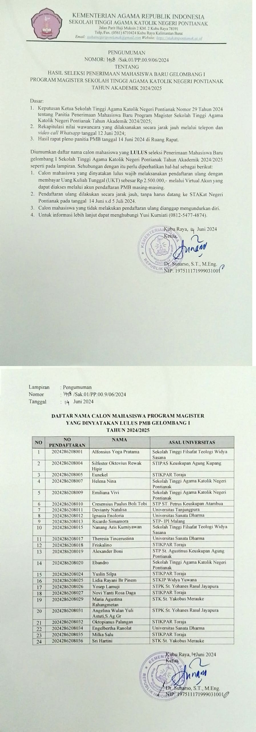 HASIL SELEKSI PENERIMAAN MAHASISWA BARU GELOMBANG I PROGRAM MAGISTER TAHUN AKADEMIK 2024/2025 STAKatN PONTIANAK