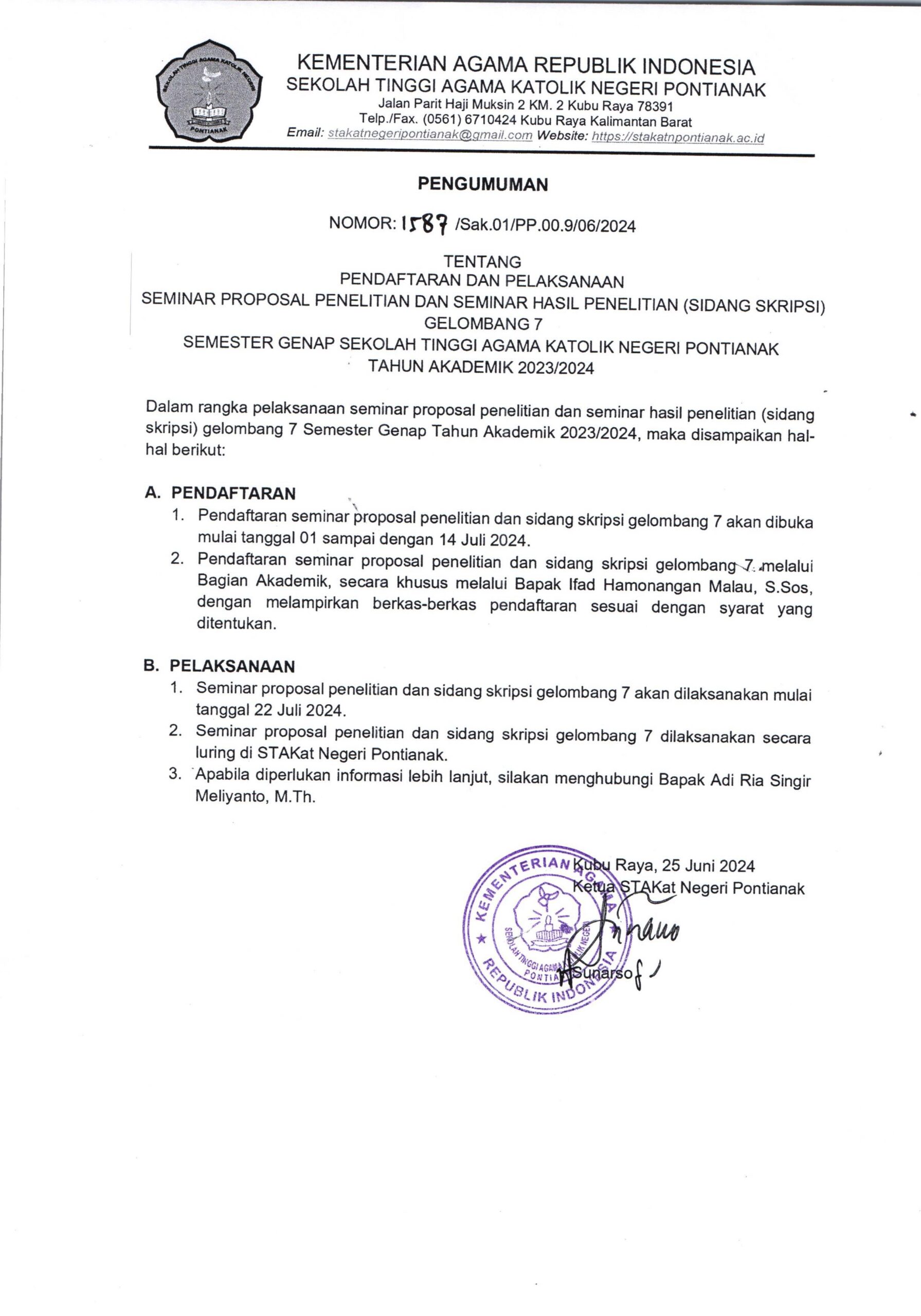 Pengumuman Tentang Pendaftaran dan Pelaksanaan Seminar Proposal Penelitian dan Sidang Skripsi Gelombang 7 Semester Genap Tahun Akademik 2023/2024