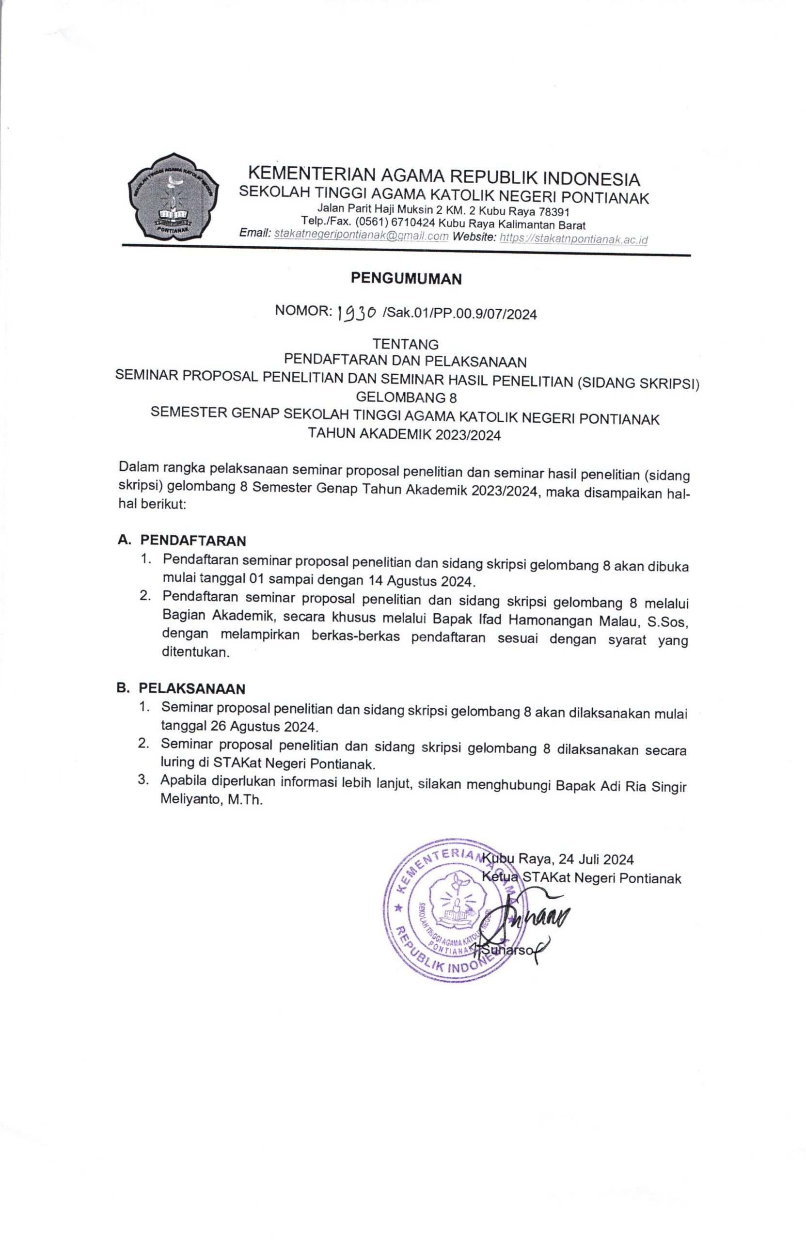 Pengumuman Tentang Pendaftaran dan Pelaksanaan Seminar Proposal Penelitian dan Seminar Hasil Penelitian (Sidang Skripsi) Gelombang 8 Semester Genap Sekolah Tinggi Agama Katolik Negeri Pontianak Tahun Akademik 2023/2024