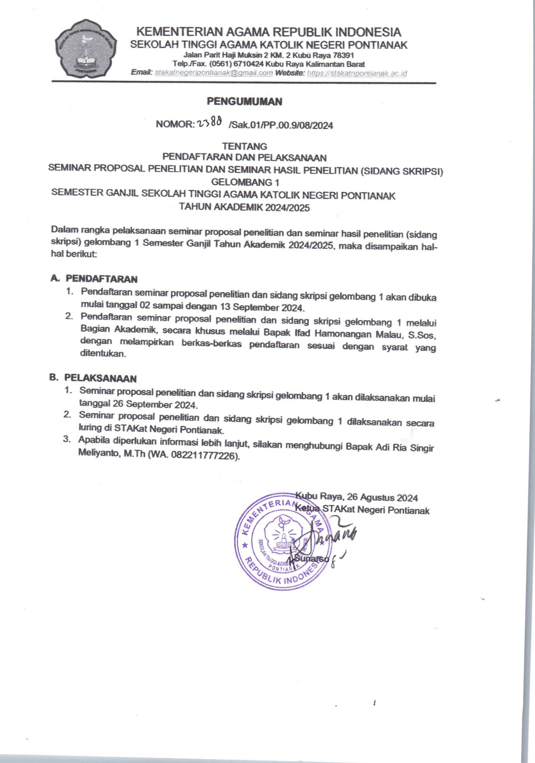 Pendaftaran dan Pelaksanaan Seminar Proposal Penelitian dan Seminar Hasil Penelitian (Sidang Skripsi) Gelombang 1 Tahun Akademik 2024/2025 Ganjil